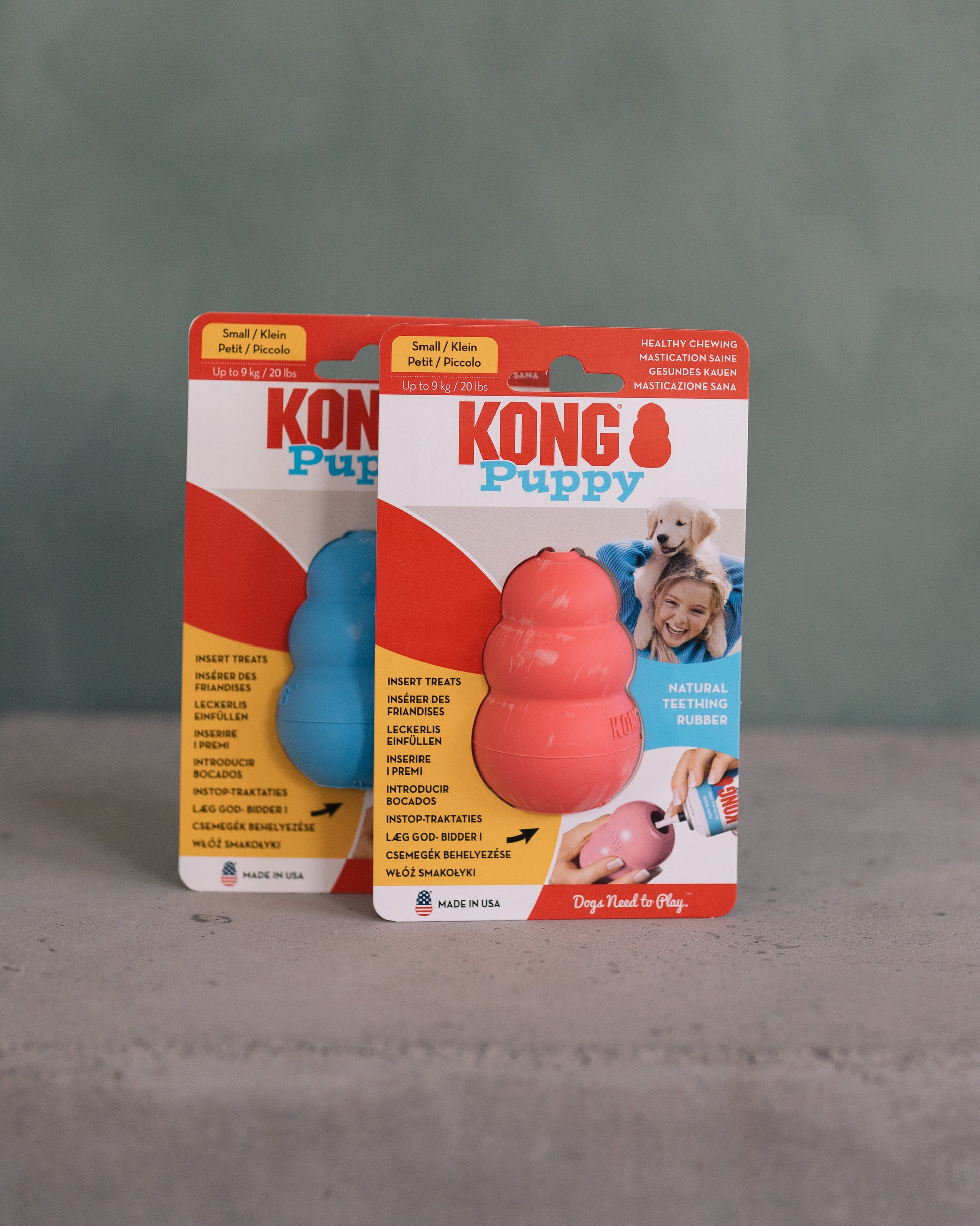 Puppy KONG är speciellt framtagen för valpar med sina mjölktänder. Den unika blandningen av naturgummi är den mildaste i KONG-serien och är designad för valpar med 28 mjölktänder. Leksaken hjälper valpen att tugga rätt och tillfredsställa sina instinkter, samtidigt som den studsande formen gör den extra rolig för lek.