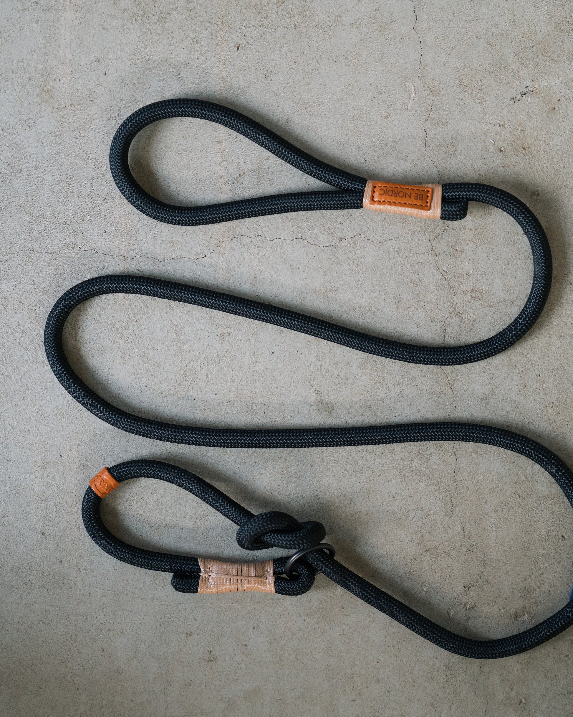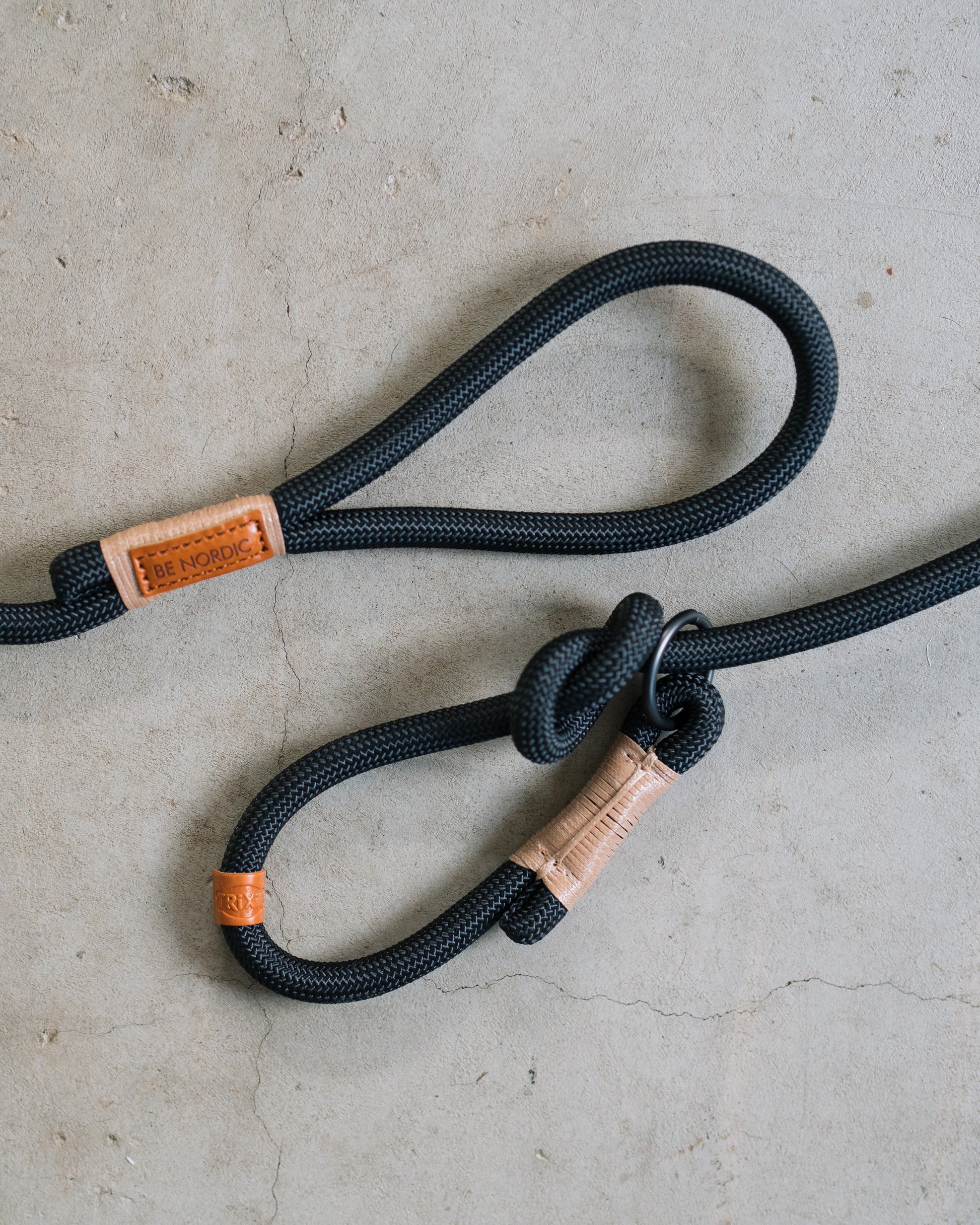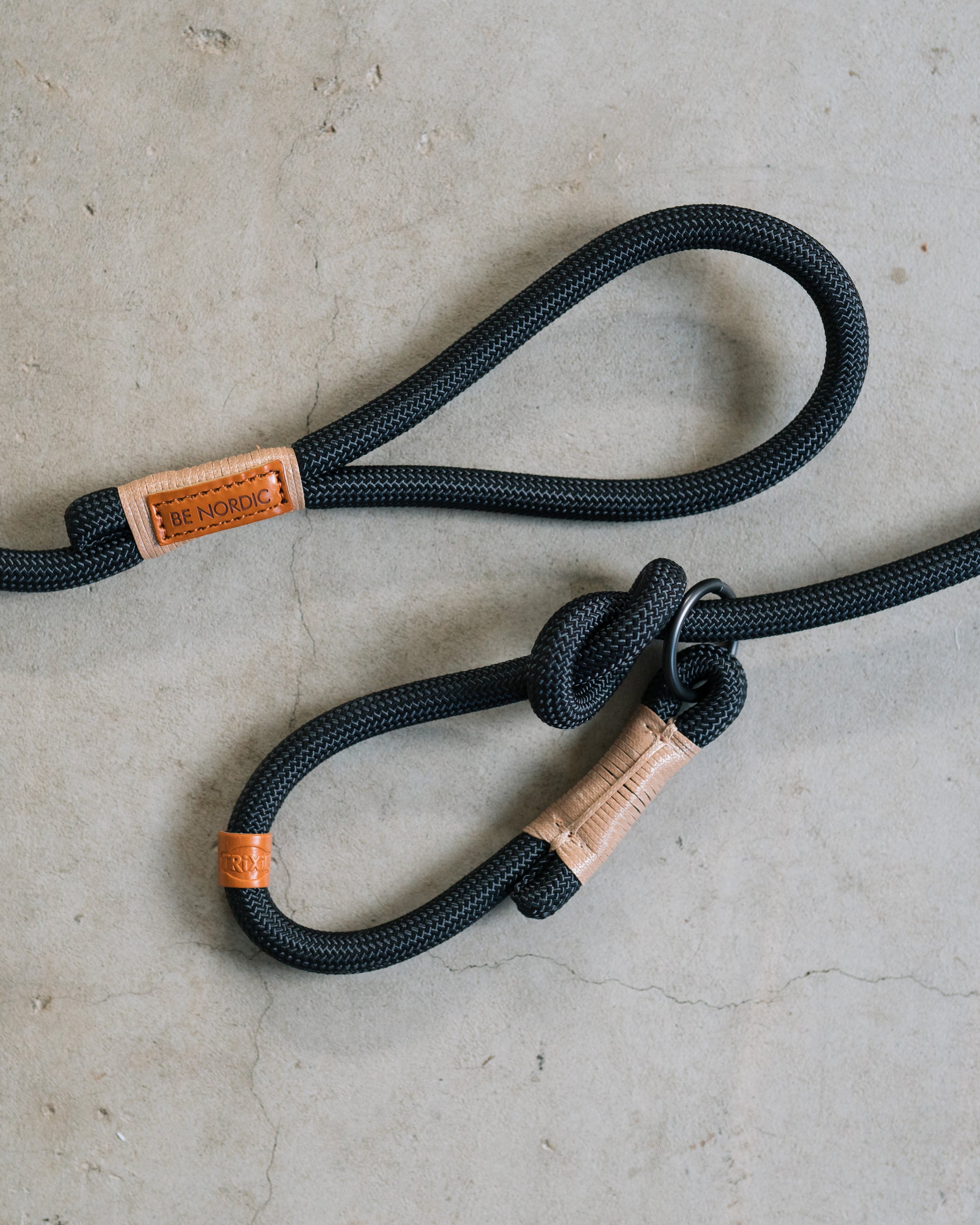 Ett stilrent retrieverkoppel med läderdetaljer, tillverkat av mjukt rep. Perfekt för träning, jakt och aktivitet.